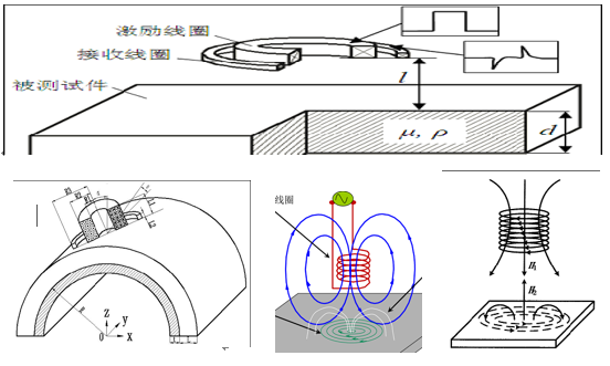 脈沖渦流檢測方法的基本原理見下圖。通有單個矩形脈沖或方波電流的激勵線圈發(fā)射出一次磁場,當(dāng)一次磁場變化時,將在被檢件中感生出渦流,該渦流的衰減特性與被檢件的磁導(dǎo)率、電導(dǎo)率、厚度等因素相關(guān),采用接收元件(線圈、磁敏或磁阻元件)測量該渦流產(chǎn)生的二次磁場,即可獲得被檢件的檢測信號,進(jìn)而得到特征時間。選定被檢件某一已知厚度區(qū)域的檢測信號為參考信號,比較待測區(qū)域的檢測信號與參考信號的特征時間,可獲得待測區(qū)域與對比區(qū)域的厚度值變化。