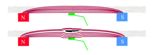 用的永久磁鐵,能產(chǎn)生一個(gè)強(qiáng)磁場并平行于管軸方向作用于管壁內(nèi)。磁力線在鋼管的管壁內(nèi)通過。當(dāng)管線出現(xiàn)缺陷、變形等不規(guī)則的情況時(shí),磁力線會(huì)偏離原路徑,并且漏磁現(xiàn)象會(huì)在以下情況下出現(xiàn):