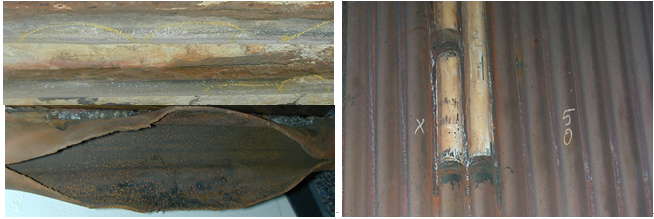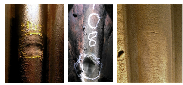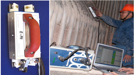 我公司引進(jìn)使用的加拿大路賽爾公司遠(yuǎn)場(chǎng)渦流檢測(cè)系統(tǒng),是目前國(guó)際上最先進(jìn)的,采用非接觸式的手持式外置式探頭(E-PIT)或 自動(dòng)爬壁掃查器(VertiScan),能快速直觀地檢出水冷壁管的宏觀缺陷,如內(nèi)外壁局部腐蝕,管壁的漸變和均勻減薄,也可發(fā)現(xiàn)氫損傷,熱疲勞裂紋和蠕變裂紋等微觀缺陷,檢測(cè)現(xiàn)場(chǎng)和缺陷管的示意圖如下: