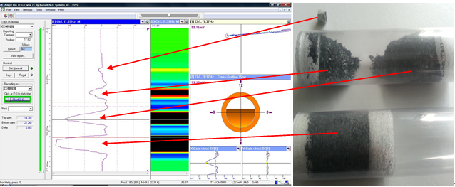 因此盡早發(fā)現(xiàn)并能定量分析氧化物的產(chǎn)生對電廠是非常有必要的。我公司引進使用的電磁檢測技術(shù),是目前國際上最先進的,該技術(shù)是加拿大路賽爾公司和美國電科院合作開發(fā)的專利技術(shù), 采用非接觸式的外置掃查器,能快速直觀地檢出管內(nèi)氧化物的分布情況,實時成像并讀取氧化物占管內(nèi)截面積的百分比,檢出靈敏度為3%, 定量精度為+/-5% 以內(nèi)。如下圖所示:
