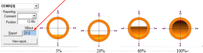 選擇波形上的不同位置可以讀取出堵塞量的百分數(shù),同時也能直觀的看到管內(nèi)的堵塞量,下圖為四個波峰直觀的堵塞量。